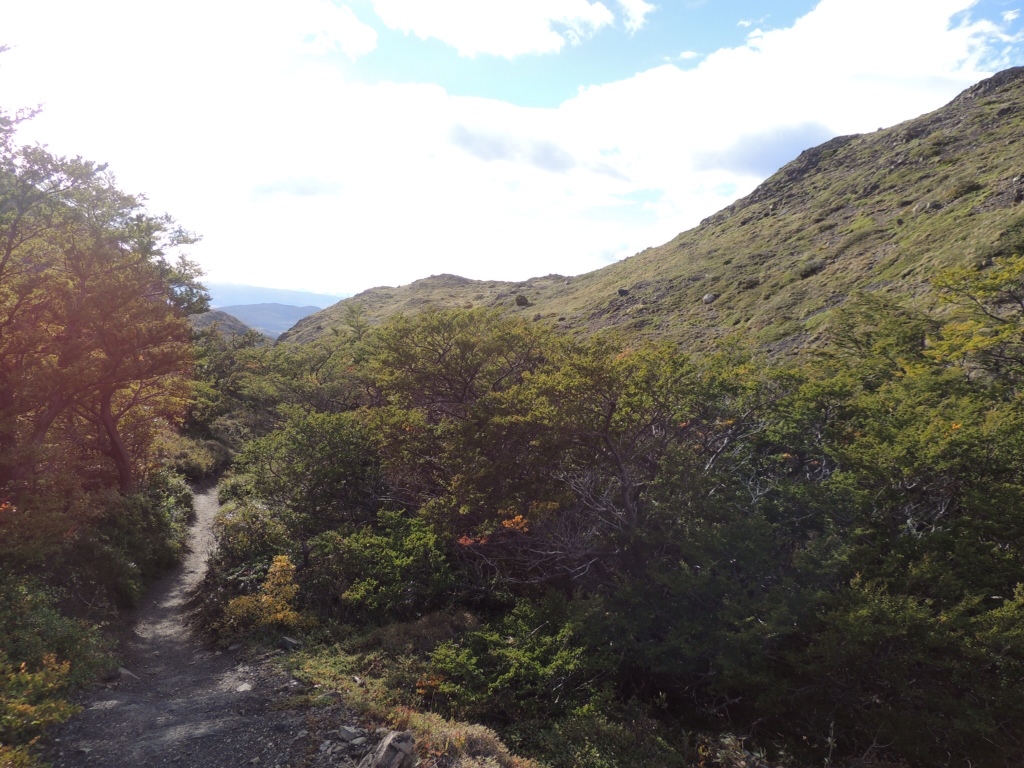 With a lengthy climb ahead of us we excitedly began the long ascent. Although strenuous, the scenery was simply breathtaking as we trekked narrow paths above the river raging through Valle Ascencio. As we climbed, loose gravel rattled off the cliff side and deep into the valley below. An Autumn palette of colours on the mountainside was now set against occasional glimpses of the Torres themselves and the lengthening of the sun’s rays dipping below the jagged peaks in front of us. The trail dipped up and down through dense forest still damp from the previous days’ rain, now more challenging with the added weight on my pack.