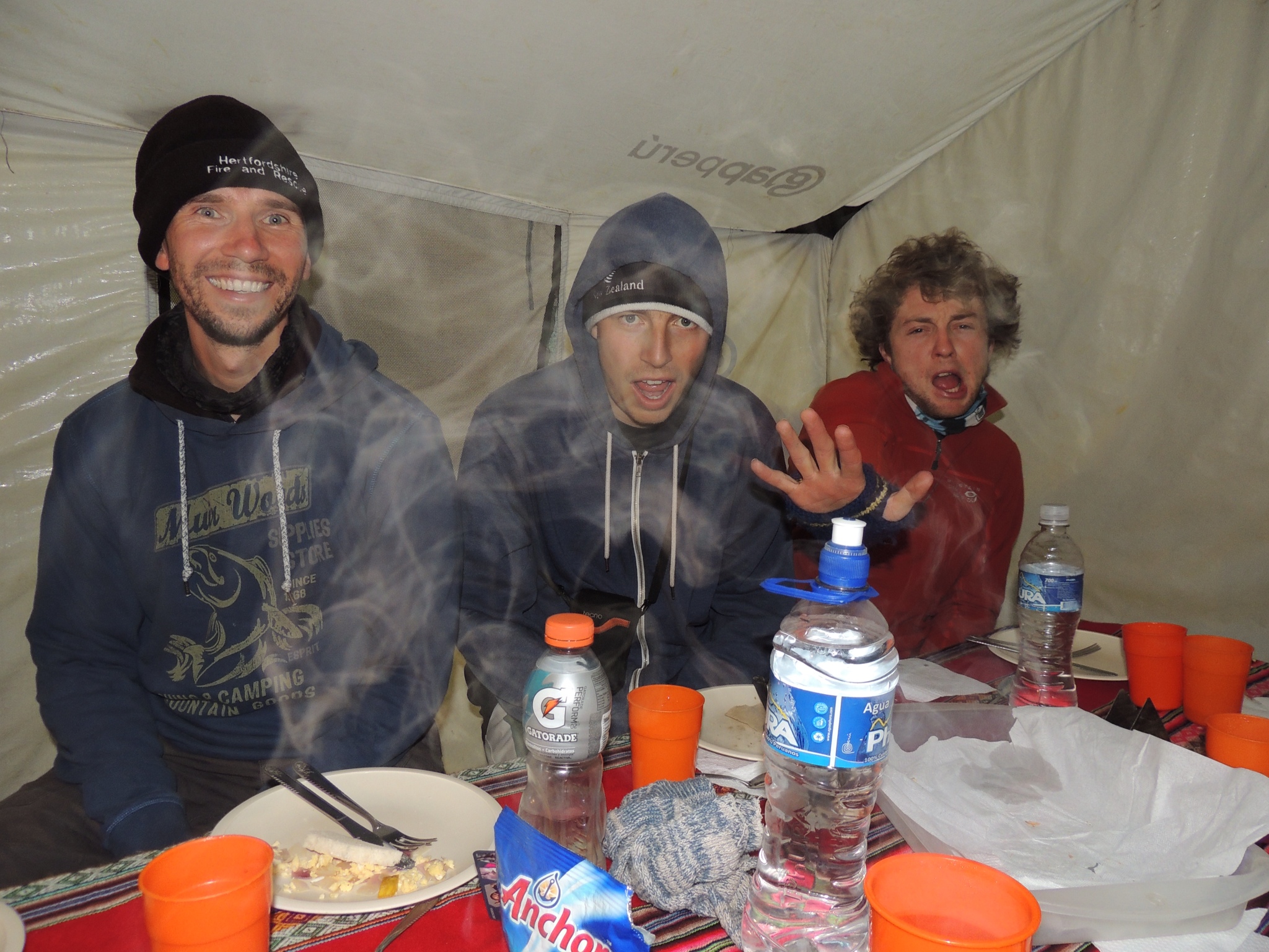 Richie, Stu & Tom grin across the breakfast table on a cold Inca Trail morning.