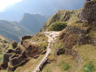 The next day was an early start. Due to some unforeseen group sizing (and mainly just me being an unattractive tent companion) three of the girls had decided to sleep in one tent, meaning that I had suffered through the coldest night alone in my tent. The porters delivered our hot coca tea and warm water to our tent doors (premium tour, remember!) and we stumbled into breakfast. I was thrilled to learn that Richard's girlfriend, Claire, had had a dirty dream about me the night before. Good morning! The final full day of trekking before reaching Machu Picchu itself took us over one more high pass before descending into the Cloud Forest, a beautiful three hours of lush green vegetation, a causeway and a stone tunnel. The afternoon ended with the ruins at Phuyupatamarca, ('Town Above the Clouds') and Wiñay Wayna ('Forever Young') ruins, the latter a stunning terraced hillside site, with panoramic views of the valley below and just a short hike from Machu Picchu the following morning. We thanked our porters that evening at the last supper and they taught me some dirty Quechuan words.