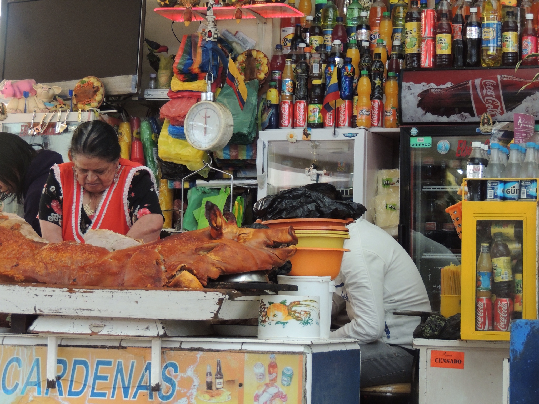 Before leaving, we were introduced to Ecuadorian cuisine at Mercado 10 de Octubre with a heaped plate of Hornado, whole-cooked pig from gigantic ovens, shredded and served with crackling, maize blanco, ensalada and chilli. As we wandered past the vendors, each of them selling exactly the same thing, they shouted and offered us a taste of their pork in order to entice us to sit down. And sit down we did, to one of the best meals I have had in South America thus far.